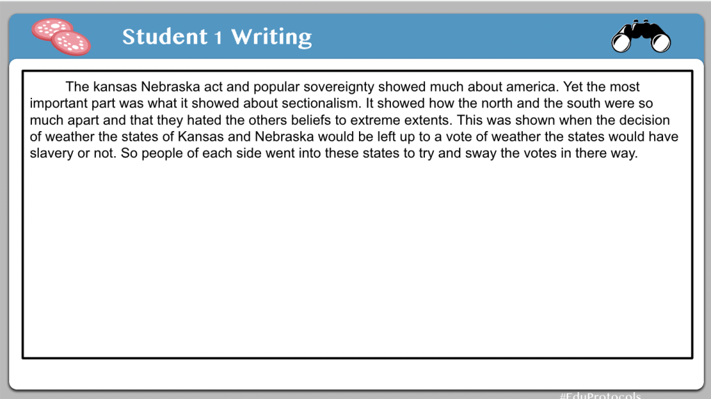 Another challenge I faced today was during a Cybersandwich activity focusing on the Kansas-Nebraska Acts. This activity involves students reading for 10 minutes, taking notes, pairing up for discussion, and then answering a question related to the topic. However, we struggled to complete the activity within the allocated time of 25-30 minutes. It felt like a disaster, especially when I realized that I had accidentally shared a Cybersandwich slides with my notes already included.