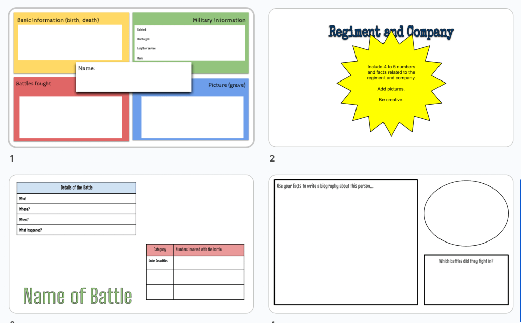 Moving on to our next topic, the students continued their research on civil war veterans. We started by compiling a list of names from the cemetery located behind our school. To facilitate their research, I prepared a series of Eduprotocols specifically designed to aid them in this endeavor. The students had the opportunity to utilize a Frayer model, engage in Number Mania activities, and create a detailed slide presentation to effectively capture and organize the valuable information they discovered.