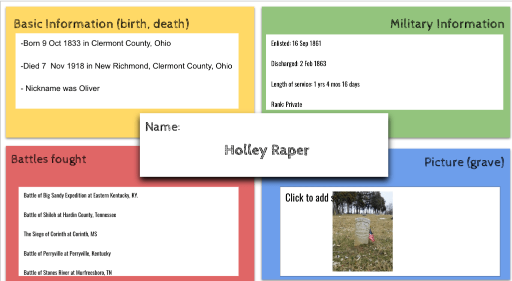 With the end of the school year approaching, I wanted to give my students a chance to connect with history on a personal level. Thus, I assigned them a research project on local Civil War veterans. The aim was for students to dive deep into our community’s history, uncovering stories and insights about the brave individuals who fought in the Civil War.