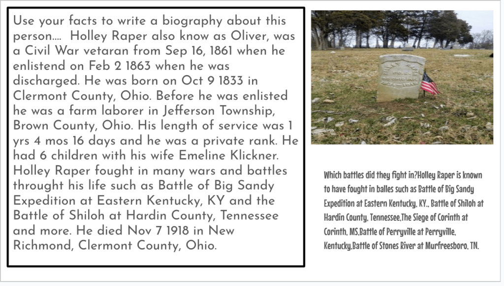 With approximately 25-30 minutes of class time remaining, I shifted our focus to researching local Civil War veterans. This assignment aimed to encourage students to explore the contributions and sacrifices of individuals from our community during the Civil War. It was heartening to witness the dedication and enthusiasm with which students delved into their research, showcasing their curiosity and empathy.