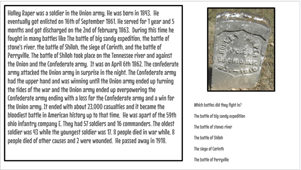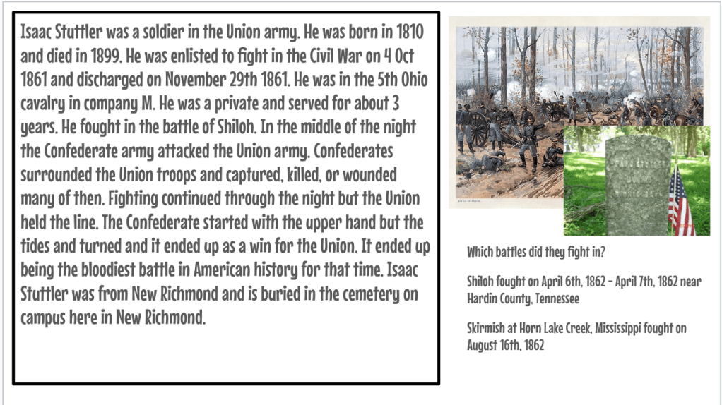 Monday’s lesson successfully combined interactive and informative activities to engage students and foster a deeper connection with local history. The Number Mania EduProtocol allowed students to explore mathematical concepts while delving into the story of the 59th Ohio Volunteer Infantry. The option to research local Civil War veterans or complete the Number Mania activity empowered students to choose their preferred learning approach. Furthermore, the Gimkit quiz consolidated their knowledge of basic Civil War information. Overall, the lesson provided an enriching experience that stimulated curiosity and encouraged active participation among students.