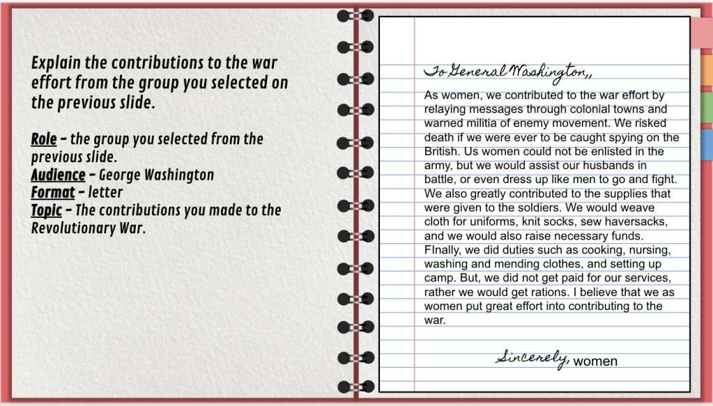 For the end product, I wanted to see what the students would create with the airEMC template (This is a template made to look like an airBnB site). The purpose was to convince people to move to your colonial region. However, as students began working, I feel like the message got lost and I threw too much at them at once. I established success criteria, but many students seemed lost. It may have been the original language on the slides of choosing a “home” or it could have been that they were not familiar with airBnB. Here are some examples: