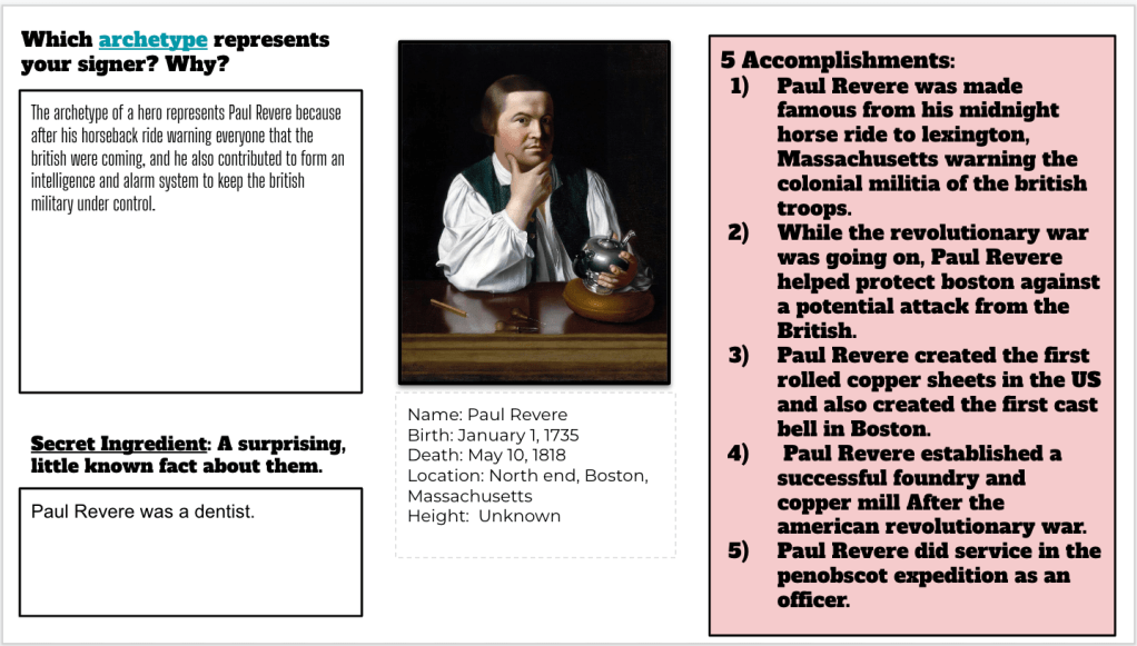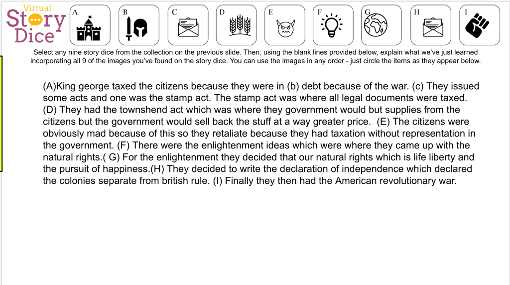 The reading I handed out for the Number Mania was simple and to the point. No pictures. No pictures on purpose. After we read for numbers, facts, and details we used the 8Parts. The 8Parts was used a visual, a way to use the details we just ead, and a way to work on some ELA skills. As students analyzed the picture, I encouraged them to use nouns such as Sons of Liberty, chests of tea, ships, Boston, etc. Students also sourced the painting of the Boston Tea Party. Finally, they created a summary and pasted their summary onto their Number Mani slide. The two EduProtocols were a perfect compliment to each other. Here are some students examples: