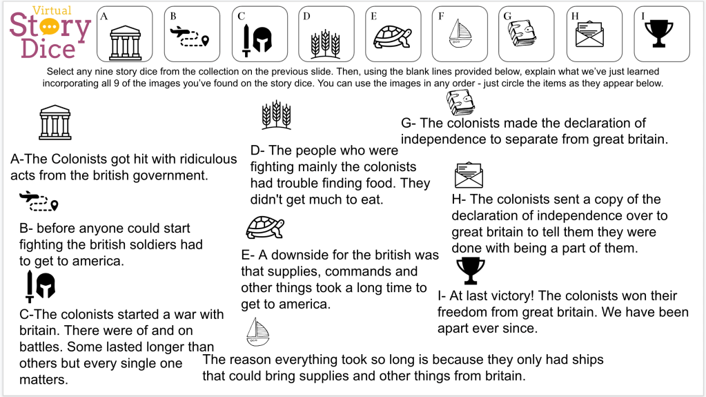The Graffiti board wordbank created by the students would serve as a guide for our next activity – a Number Mania. For the Number Mania I gave students 10 minutes to look up events related to the American Revolution. They could use the word bank as a guide for their searches. Students submitted multiple facts, years, and events through a Google Form. I converted the Form data into a Spreadsheet and shared through a Google Classroom assignment. Finally, students had 20 minutes to select 5 events and place them on a timeline. They also added three pictures and a title. The last part of the Number Mania was for the students to define the American Revolution time period. Looking back on the Number Mania, I need to have students work on paraphrasing information. It’s time for some ParaFly to come out next week.
