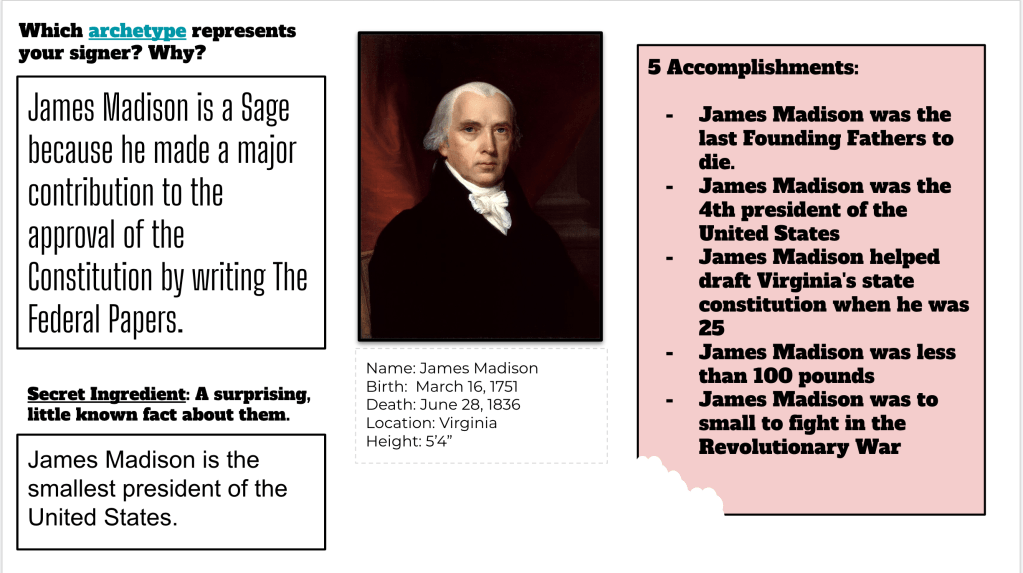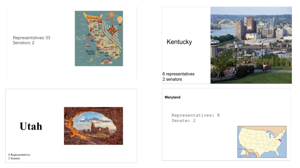 The next step for the lesson was a Thin Slide. I gave students 5 minutes to add a picture of a state, add the name of the state, add the amount of representatives for the state, and how many the senators for the state. I quickly learned that I needed to directly link the House of Representatives and the US Senate to the instructions. When the timer went off I asked the students, “What do you notice?” Right away, they noticed that every state had 2 senators and the amount of representatives varied. Then. I asked, “Why do you think one number stays the same and the other number varies?” They had some guesses, but this was the point of the lesson for the day.