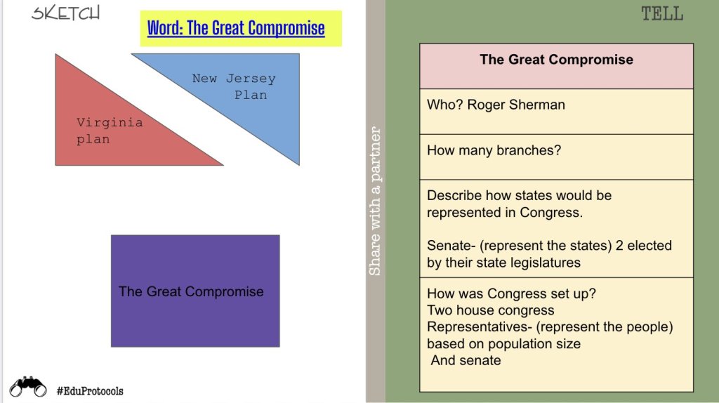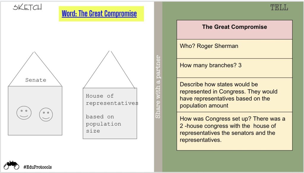 I used a variety of EduProtocols this week including Sketch and Tell, Number mania, and the 3xCER. The Sketch and Tell works great with the Great Compromise. This helps students visualize structures of the legislative branch that was proposed. The Number Mania paired with the 3/5ths Compromise was okay. I always love the 3xCER as this was our third rep this year.