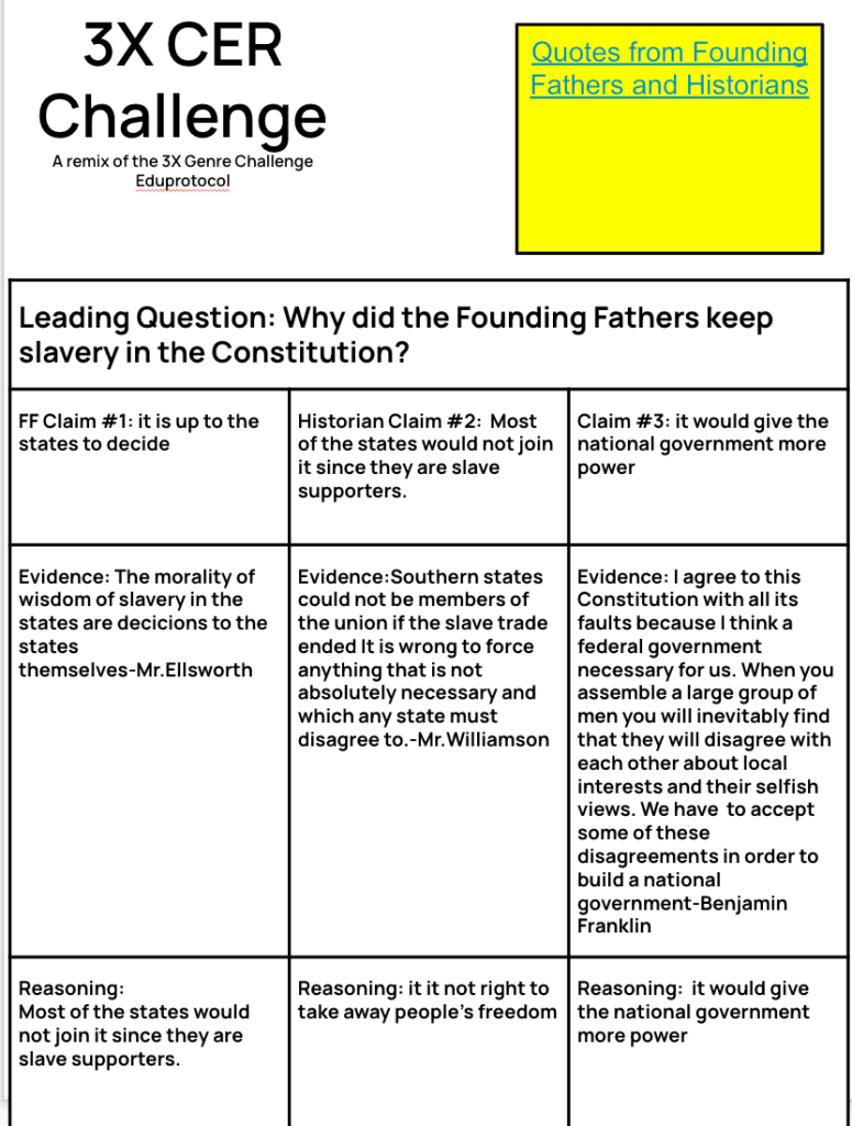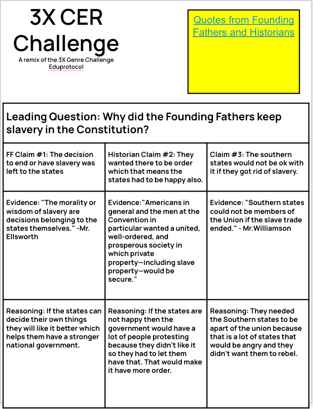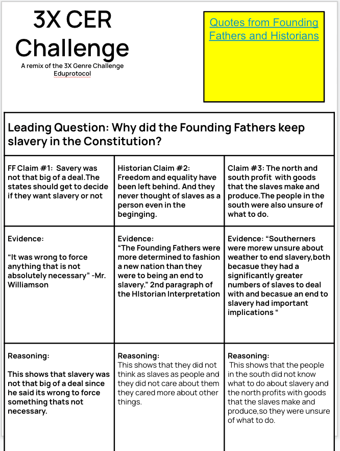 On Friday, students completed a 3xCER evaluating why the founding fathers kept slavery in the Constitution. I wanted them to keep that practice going writing claims, evidence, and reasoning. With EduProtocols, reps are important!! On this 3xCER, the question was, “Should the Constitutional Convention be considered a success?”