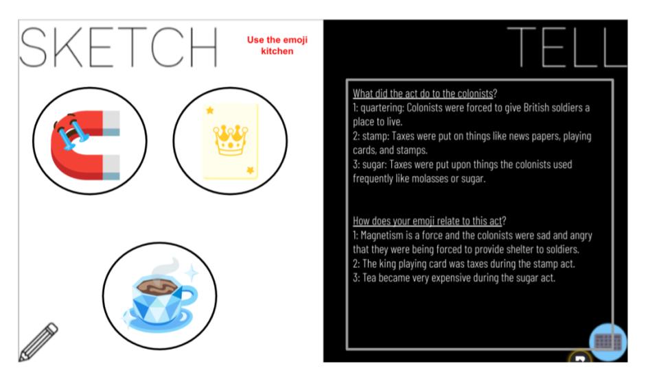 To follow up the guided notes, I left a Sketch and Tell-o activity. I had the students use the Emoji Kitchen to create visual representations of the British acts. The goal was for them to combine two emojis into one new emoji that represented each act, like using a tea cup and an angry face to illustrate the Tea Act. It’s a fun and creative way to get them thinking beyond the text, and I was hoping it would engage their imaginations a bit more than traditional worksheets.