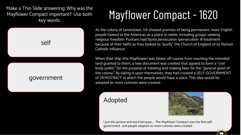 After we had our discussion, I wanted to keep the momentum going with some retrieval practice. I’ve been making a conscious effort to build retrieval practice into the routine so it becomes second nature. We started with a WordWall activity where I posted a 13 Colonies map and had students, from memory, drag and drop to match the colonies. They got one shot to do it. Most students nailed 13 to 14 colonies correctly, which was awesome to see—proof that the practice is starting to pay off.