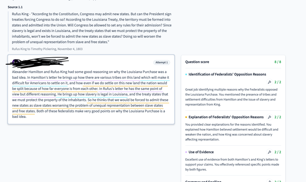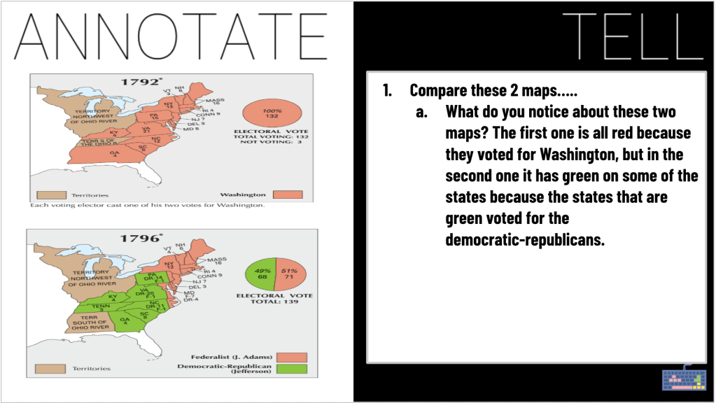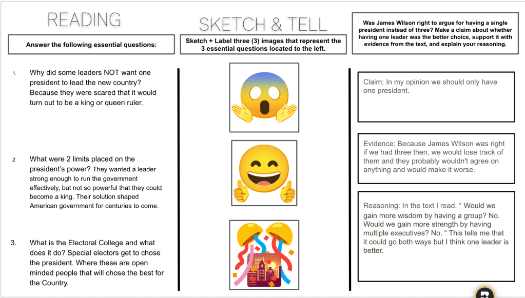 To deepen their understanding, students analyzed a primary source excerpt from James Wilson, who argued for having one president. Through an Annotate and Tell activity, they highlighted key points and answered these questions: