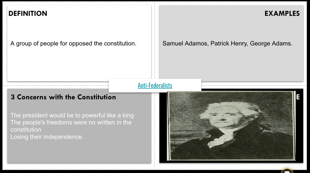 By Friday, we were back on track and moving forward with the next big question in our unit: “What were the arguments over ratifying the Constitution?” This lesson delved into the emergence of Federalists and Anti-Federalists, emphasizing how the newly proposed Constitution required states to not only understand but also buy into the vision for a federal government.