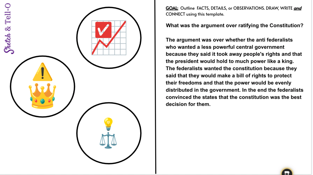 To wrap up, students used Emoji Kitchen to visually represent three arguments over ratification. They selected emojis to symbolize each argument and wrote a summary answering our essential question: “What were the arguments over ratifying the Constitution?” This activity added a creative and personal element to the lesson, encouraging students to connect with the material in a unique way.