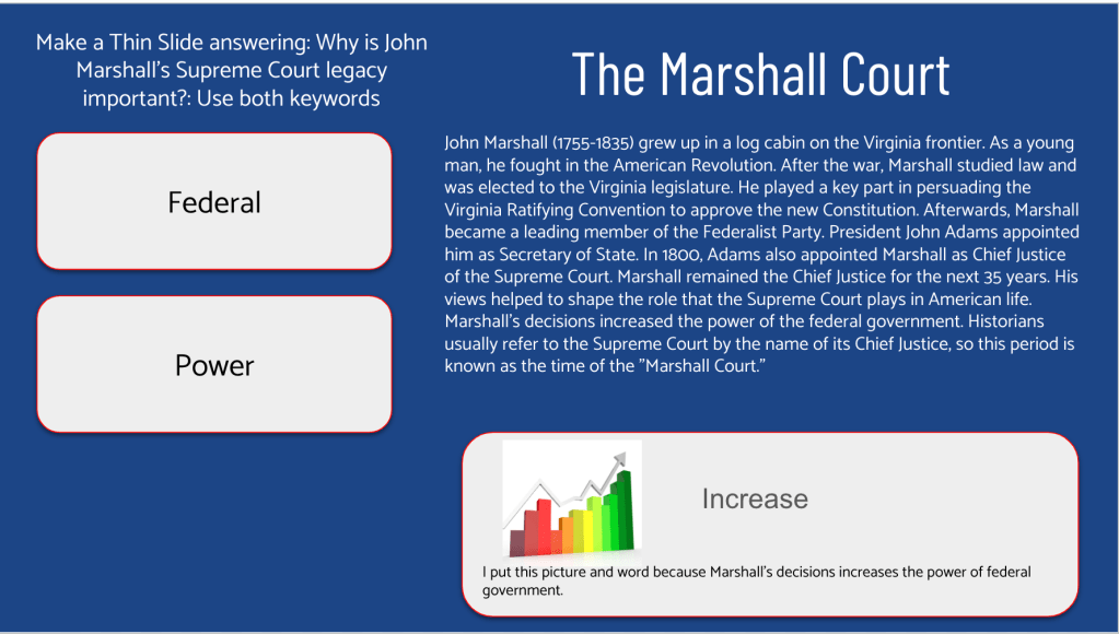 They added a powerful quote, one or two relevant images, and a title that helped summarize the case’s importance. I’ve used Thick Slides a lot this year, but I liked this one because it helped students pull together multiple layers of information on a tough topic and create something visual that forced them to organize their thinking.