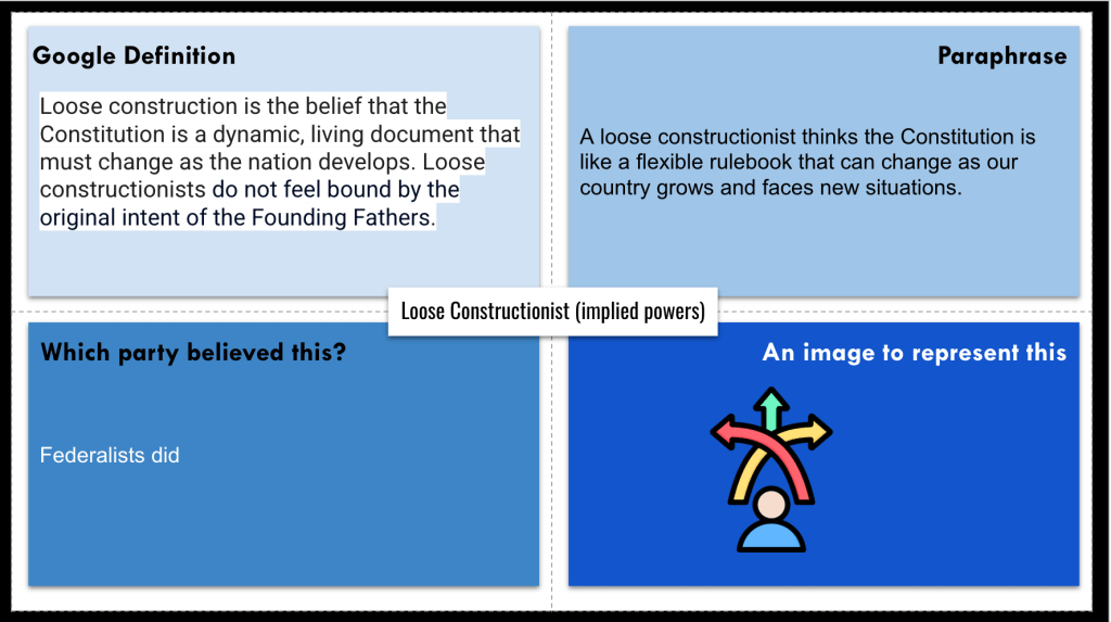 Next, students completed two Frayer models, one for Federalists and one for Anti-Federalists. They defined each group, listed key characteristics, included examples of prominent figures, and noted non-examples. This activity helped clarify the contrasting perspectives on the Constitution: