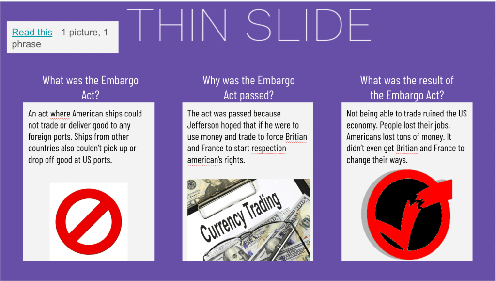 Thick Slide Assessment To wrap up the lesson, I posted a Thick Slide task. Students condensed the information from their station rotations into essential facts, answering the question, “How did the triangular trade and the Middle Passage transform North America?” They also used the Slave Voyages database to find a ship that traveled to North America and gather relevant statistics. As a final touch, they included a quote from Olaudah Equiano and an image with a caption.