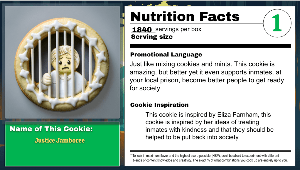 The fun part came next. I had each student pick one reform movement and design a cookie that symbolized it—name, promotional language, and inspiration. Not because I think students should go into advertising, but because it gives them a creative outlet to synthesize what they’ve learned. I didn’t use a fancy template. I just gave them space and a task: connect what you learned to something that feels new and fun.