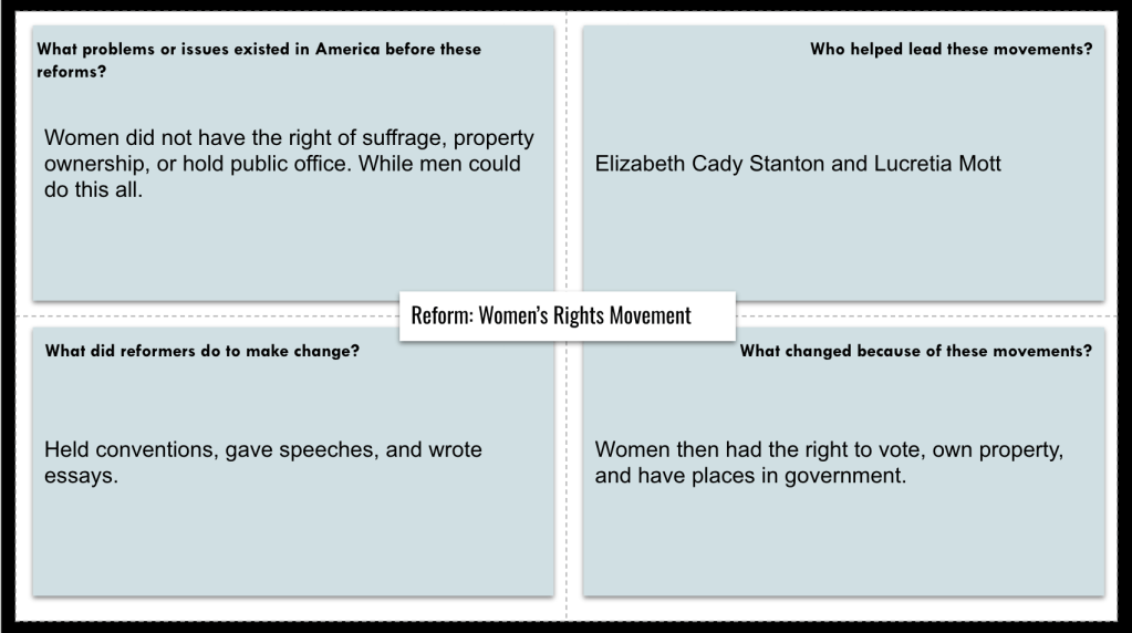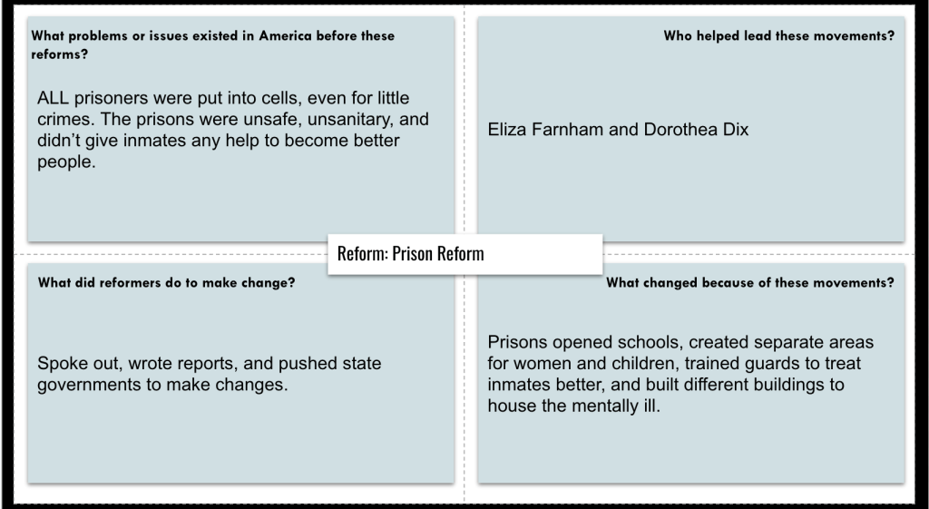 Then we jumped into four reform movements: education, prison, temperance, and women’s rights. I gave them one-page readings for each. They had to pick two and fill out a Frayer Model—with prompts like: