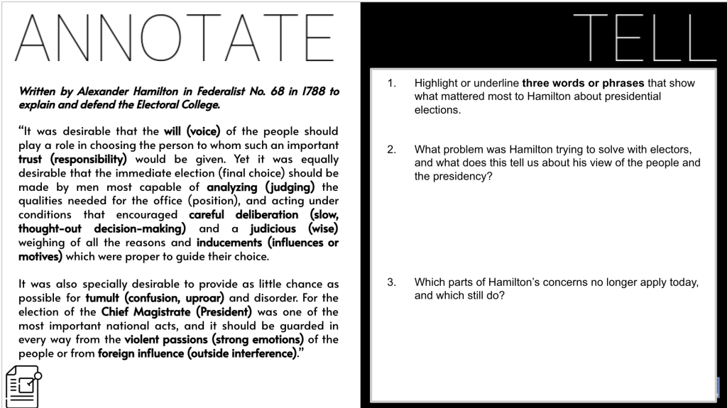 To get us started, I used questions pulled from the U.S. citizenship test focused on principles of government. I asked ten questions out loud and told students the goal was six correct answers, just like the traditional citizenship test requirement.